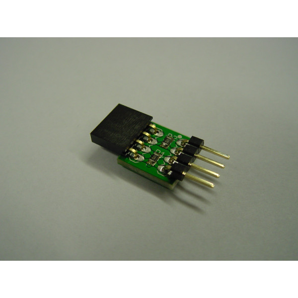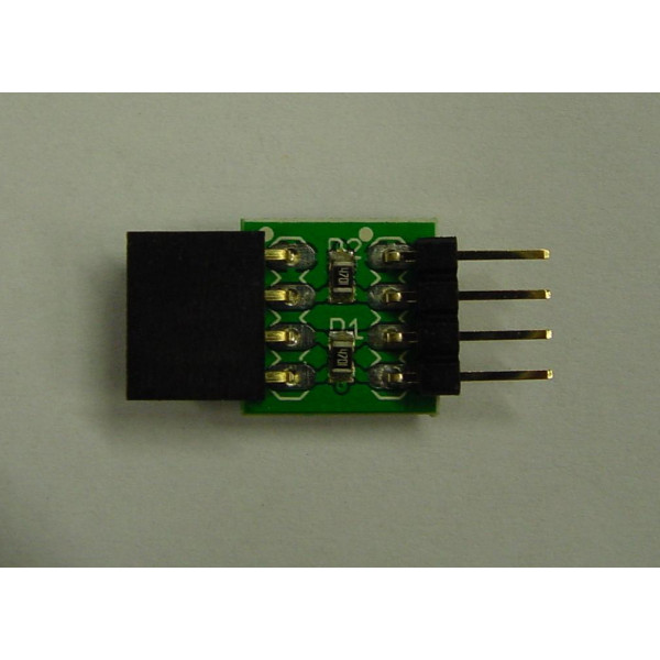 The PCB follows the bitwizard "standard" pinout. The photomodel above was assembled wrong. Sorry. Female connector belongs on the left (looks good so far, right?) but the GND, pin 1 of the connector needs to be nearest the viewer. So you'll get the female on the left, pin1 nearest the viewer (and resistor designators upside down for now).