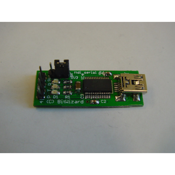 A small board equipped with an FT232RL USB to UART bridge chip. Both 3V3 and 5V IO operation is possible, and is selectable with a jumper.
