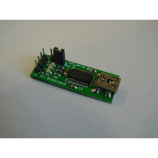 The PCB is also equipped with three LEDs: A power-LED, and two LEDs to indicate Rx and Tx activity.The 4-pin header breaks out GND, Tx, Rx, and V+ (selected by jumper: 3V3 or 5V).